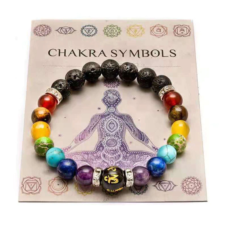 Браслет 7 Чакр із вулканічної лави, кольоровим камінням і тибетським символом ОМ